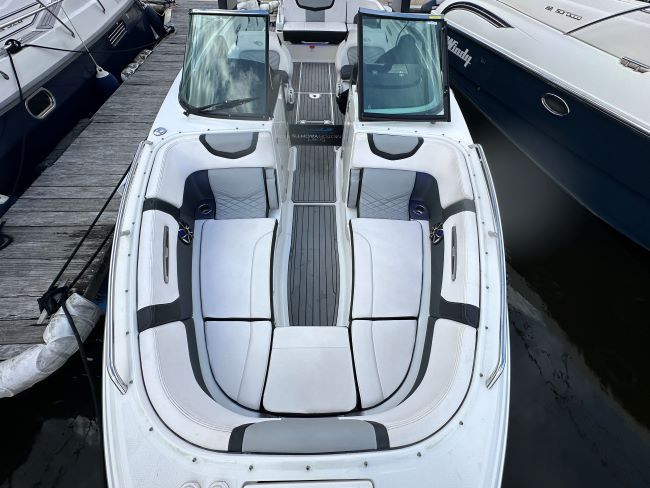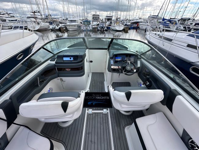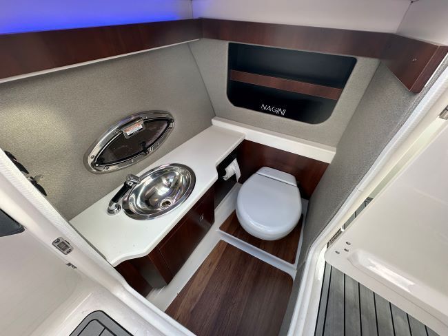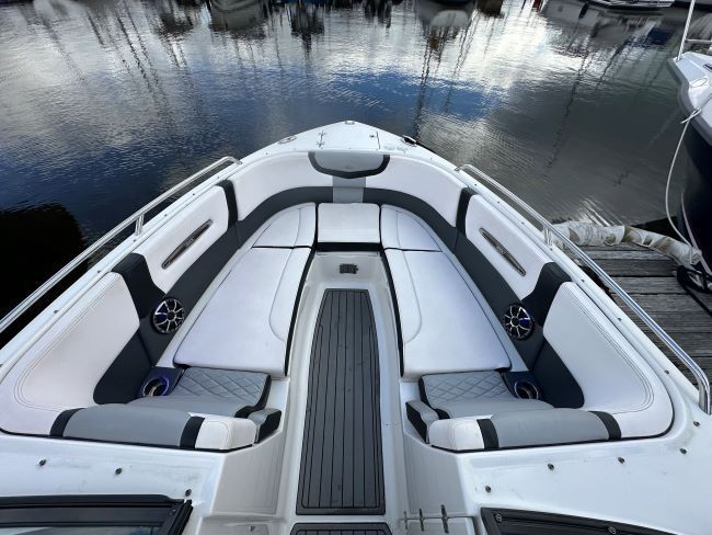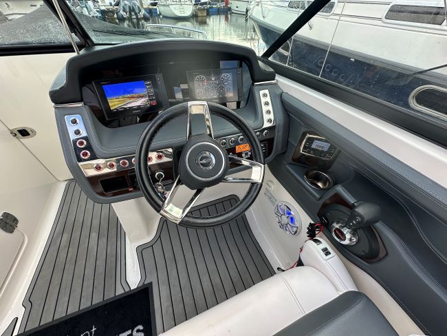 Despite its sporty nature, this boat surprises with a concealed heads to the port side, ensuring convenience and privacy when needed. Dual navigation/display screens cater to tech-savvy enthusiasts, offering seamless control and navigation options.