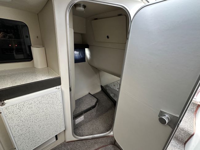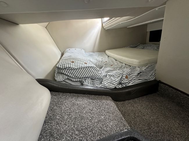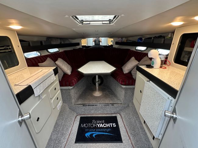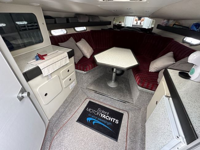 Large 'V' seating in saloon with recent upholstery, dropping table to create large double berth and new grey carpets throughout