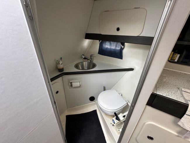 Heads, with manual Jabsco sea toilet and shower on Port side with s/s sink