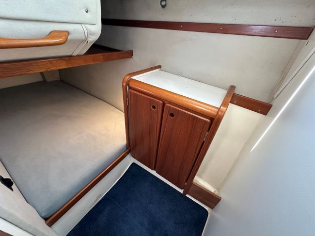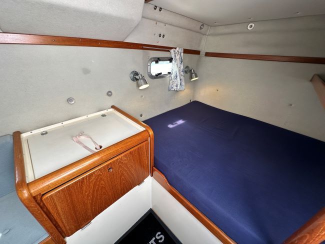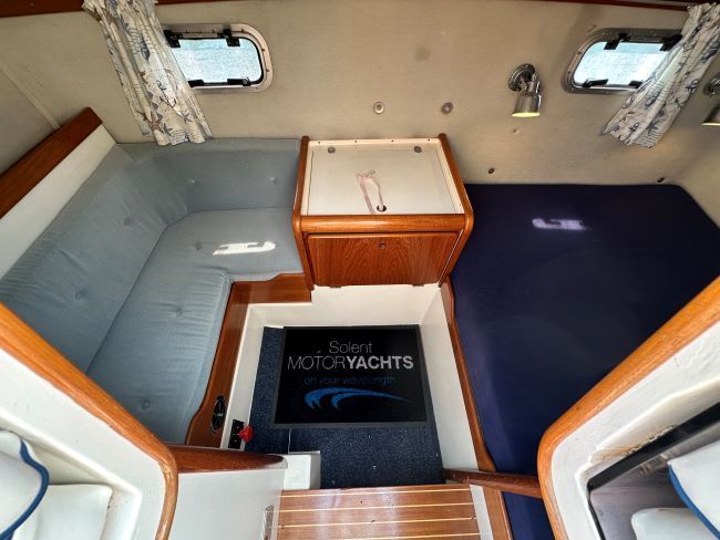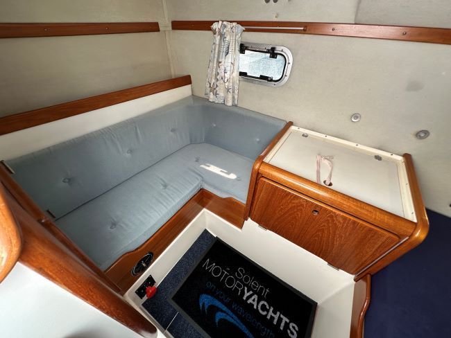 Access via a siding hatch under the aft cockpit seating with a large double to port and a sofa to stb with plenty of storage and a sink