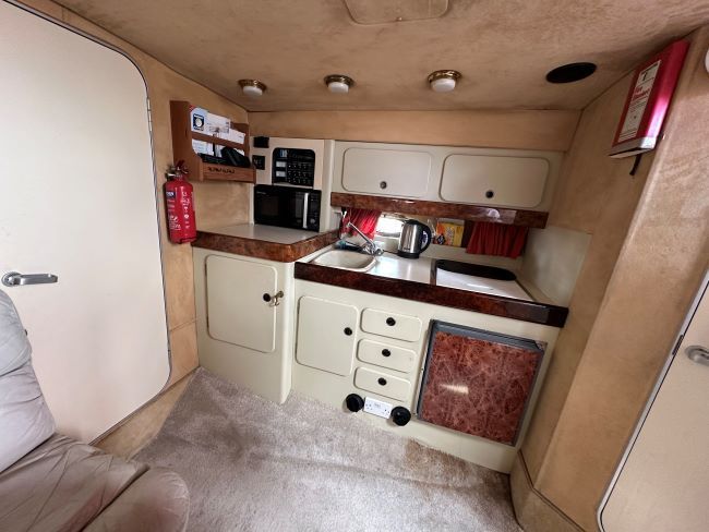 The galley area is to starboard has ample storage as well as with Russel Hobbs microwave combi and 4 ring gas hob, sink with hot and cold water supply, fridge with small freezer section and plenty of storage.