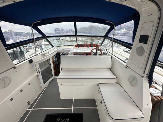 The cockpit is large and spacious with a generous Seating area including a double helm seat that pivots to create even more social seating. Doors on either side give easy access to the safe wide side decks. The helm is an impressive place with full instrumentation including the Raymarine Chart Plotters / Radar & Autopilot that was fitted in 2018. Her Captain and navigator have a comfortable bench seat which offers excellent visibility when underway. This whole area is covered by a blue canopy. This canvas can be removed, rolled up in sections, to suit all weather needs and on sunny days can be open to appreciate the warmth. Over the cockpit is a sturdy Radar Arch which can be folded down to enable cruising of inland waterways by reducing the draft to just 3.5 meters.