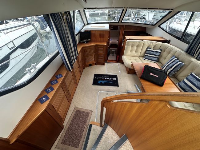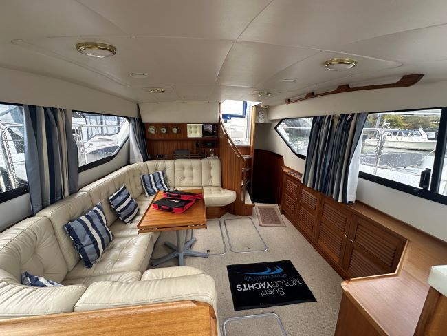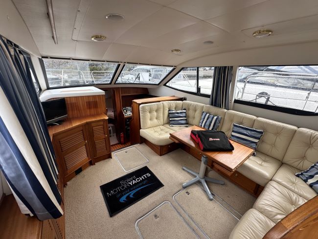 Leading from the Cockpit is a glass door with steps down to the main saloon. This is a very open, light and bright space that is complimented with panelled woodwork and cream headlining to the ceiling. A large, sumptuous sofa, finished in Cream set around a free standing table that folds out for dining.. The whole area has large windows with sliding openers that flood light into the cabin with curtains to provide privacy when required. There is plenty of storage throughout with additional cupboards providing loads of space. Controls for the warm air heating are found in this area, enabling the distribution to all areas of the boat. Access to the engines for the daily checks is made easy via three hatches in the saloon floor