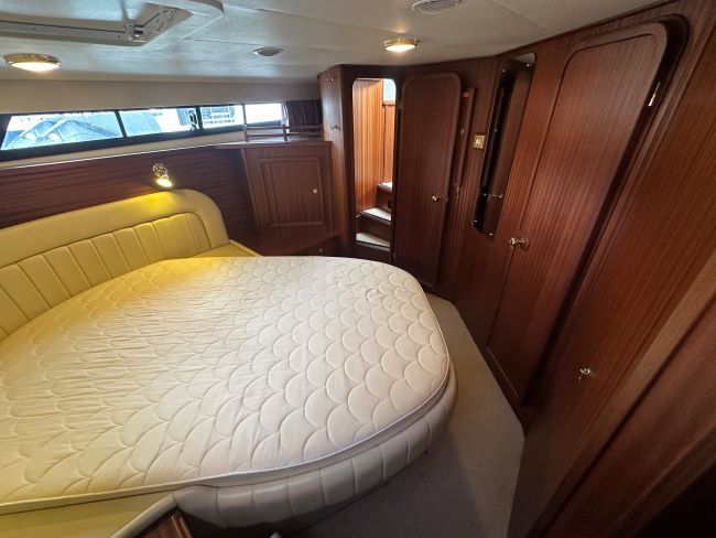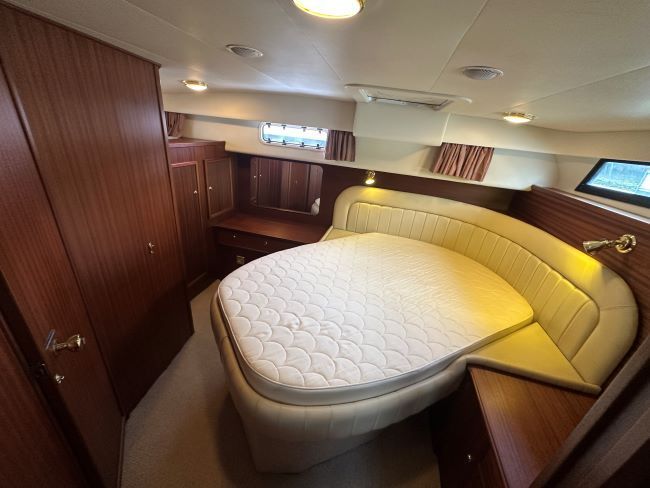 Proceeding down the spiral staircase aft of the saloon you find a huge Owners Suite with full standing headroom . A large island double bed is flanked by vanity units with storage and a Dressing Table and Hanging Wardrobe allow for plenty of clothing.