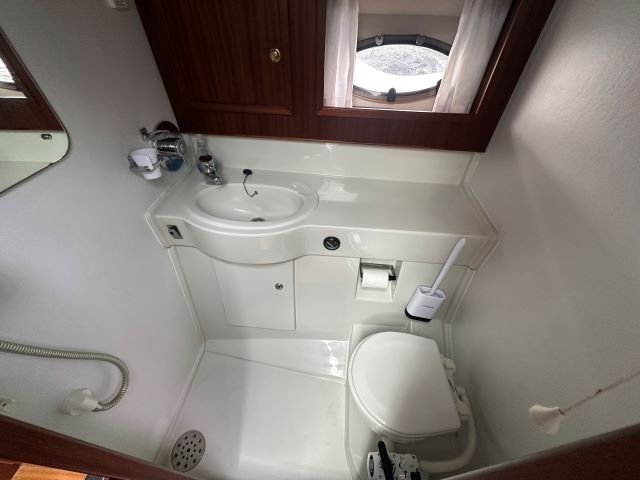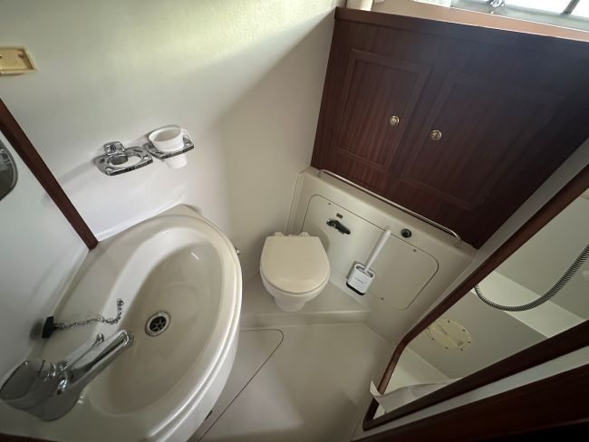 To Starboard is a separate heads and shower room with toilet, sink with mixer tap. The Shower room is a separate, generous sized area containing a moulded seat, shower head and shower door