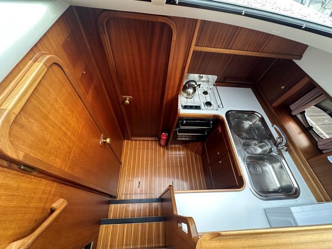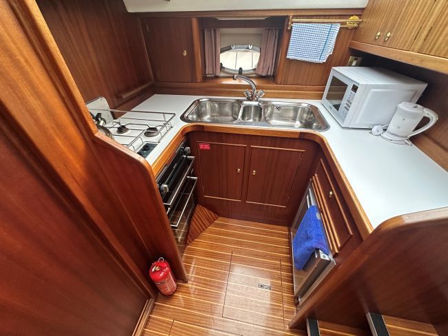 A fully equipped and generous galley is set to Starboard, with a three burner gas hob, twin s/s bowl sinks with mixer tap above. It also has good size fridge and microwave with plenty of cupboard space and lockers and a Teak and Holly Floor for easy cleaning. Any Chef will feel at home here.