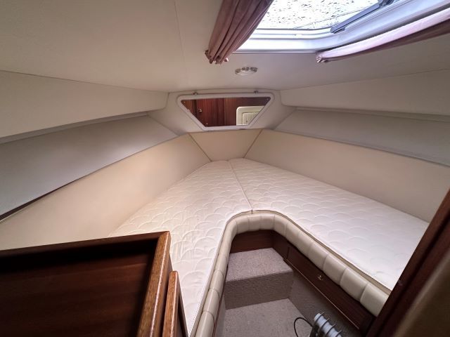 The forward Cabin consists of twin single berths with storage below. On the Forward Bulkhead is a mirror that allows light to be reflected around the cabin. It also has a warm air heating duct outlet.