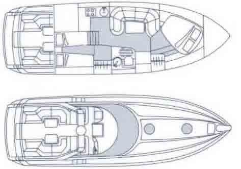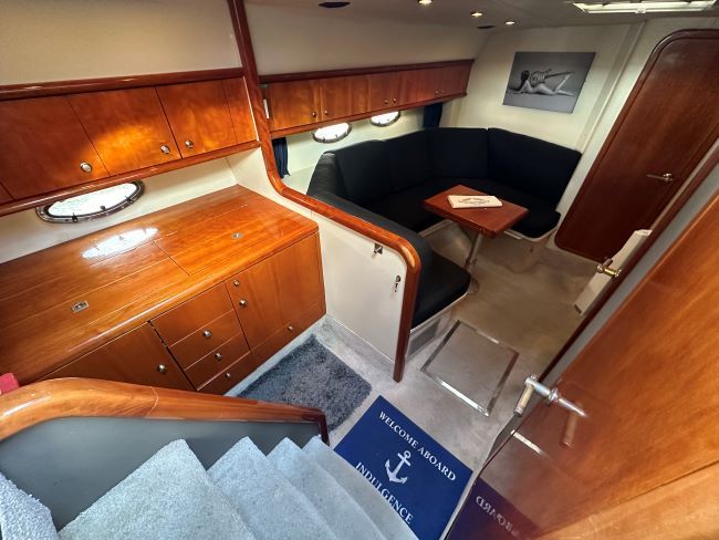 The helm position is to starboard, with navigator seating to port, there are cockpit speakers, wet bar, coolbox and engine access.