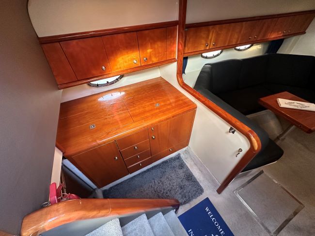 The interior has American Cherry joinery, with recent navy upholstery to compliment the cream carpet.