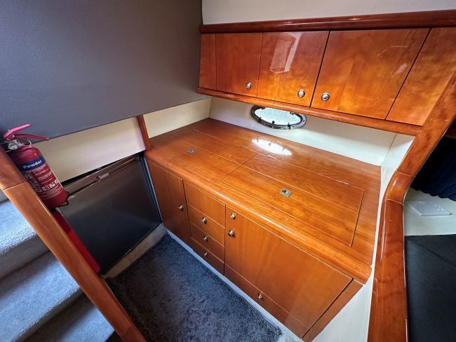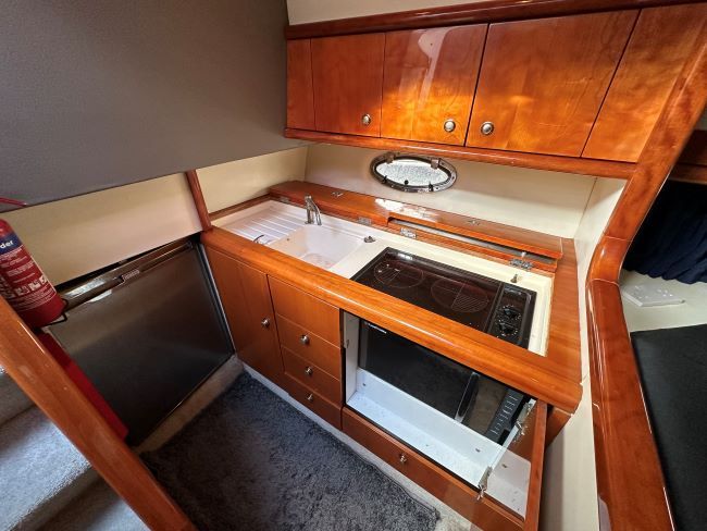 The galley area is to port and has ample storage as well as with Russel Hobbs microwave combi and twin electric hob, sink with pull up faucet and hot and cold water supply, recent Weaco S/S fridge with small freezer section.
