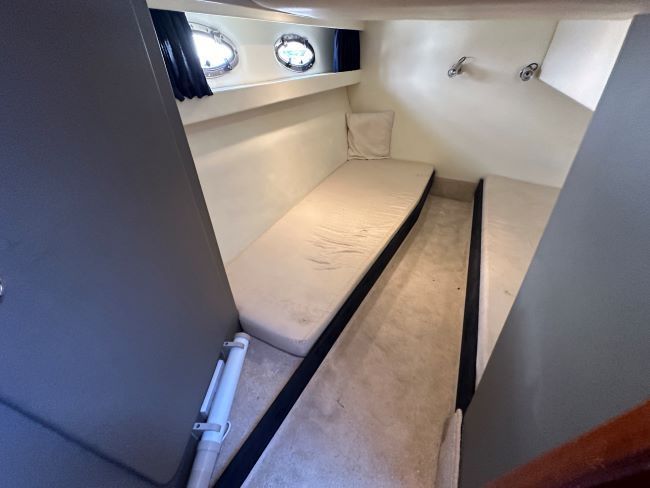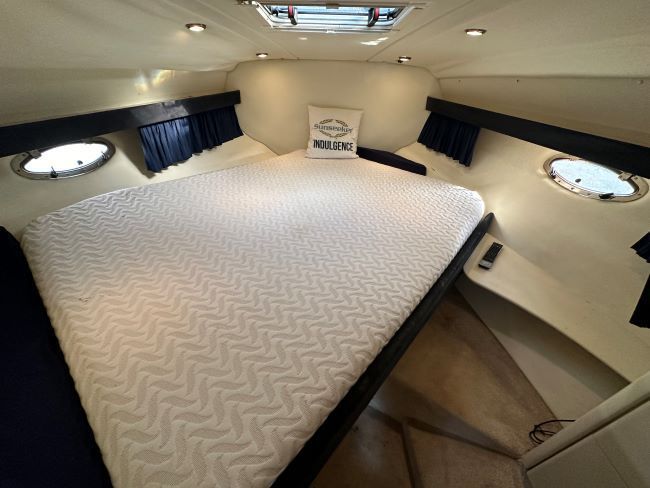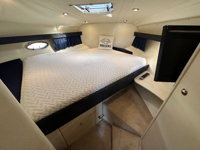 The forward cabin has an offset double berth with memory foam mattress, hanging locker and opening portholes.