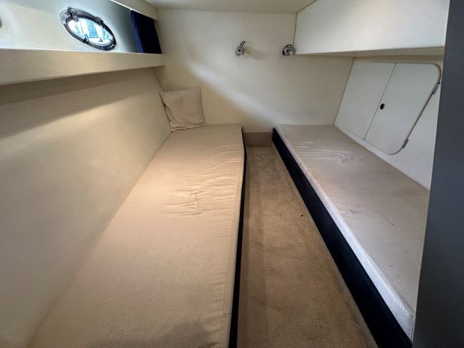 The aft cabin has two single berths, an opening porthole, hanging locker and large storage cupboard under the cockpit sole.