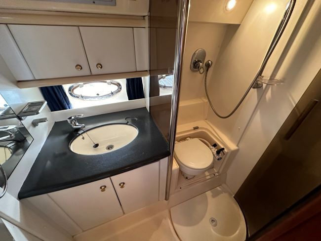The heads is to starboard containing sea toilet, wash basin, mixer tap and shower with screen.