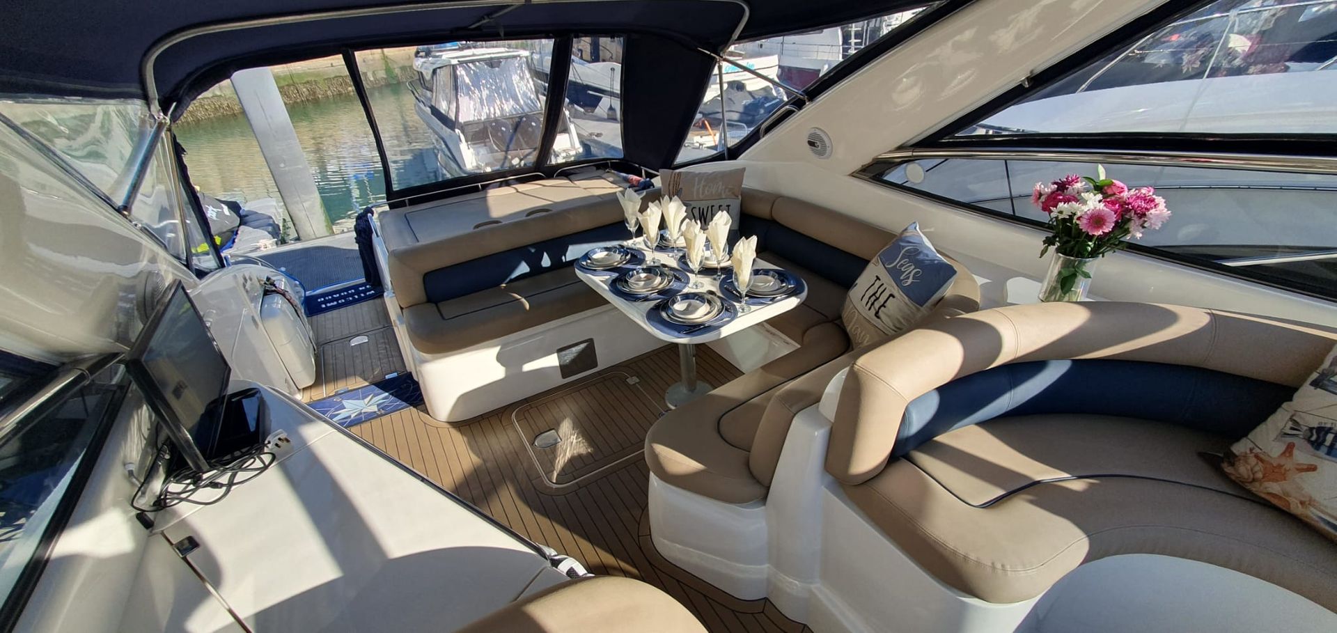 C shaped seating to port. Drop down table. Cupboards. Electrical distribution panel. TV, DVD and stereo. Opening hatch. Opening port