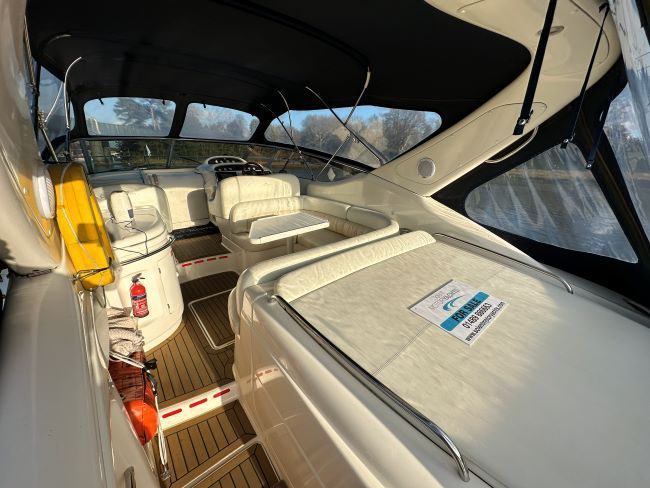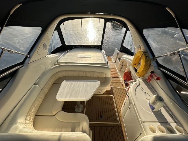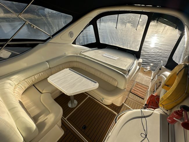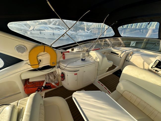 The cockpit includes a hot/cold deck shower, drinkholders, courtesy lights, wet bar with sink and a 50lt fridge, liferaft holder, gas bottle locker, and speakers for the Clarion marine stereo system.