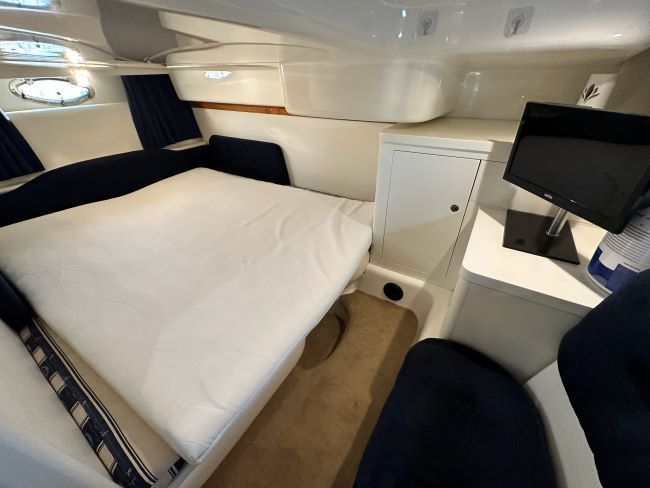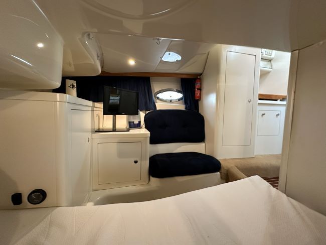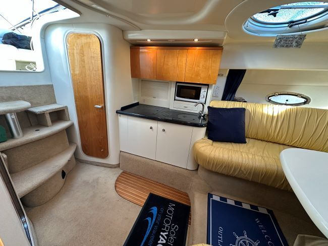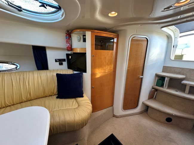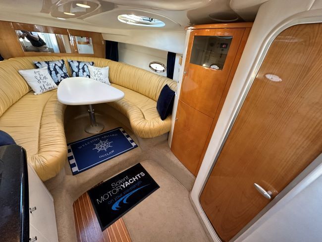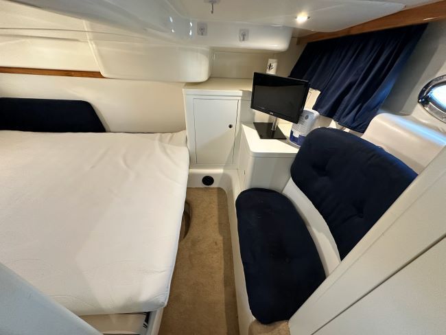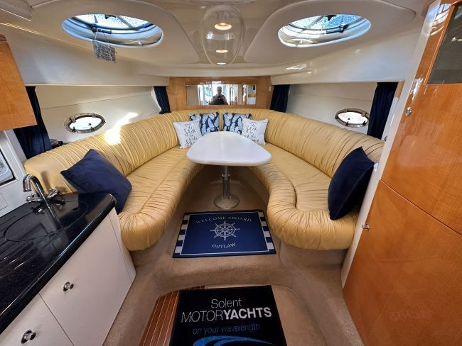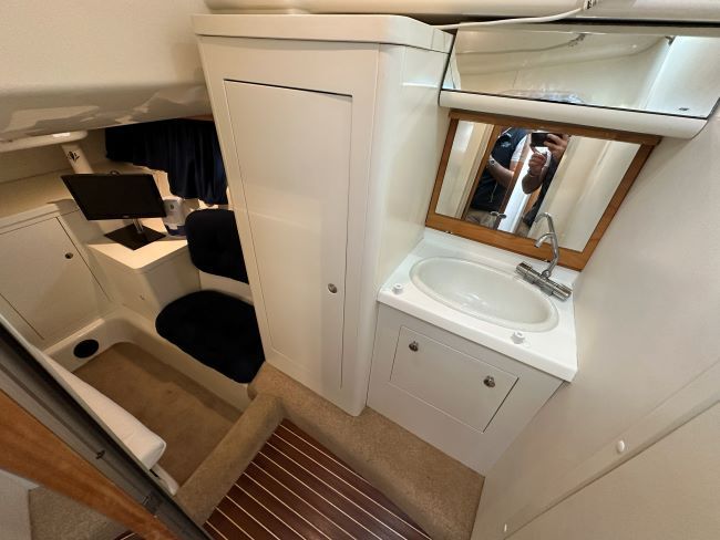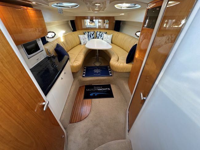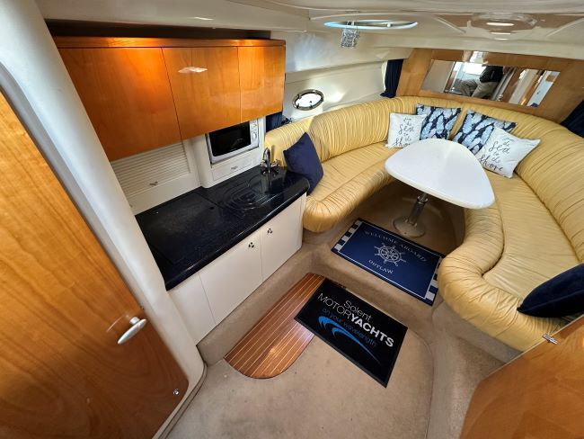 U-shaped lounge in the bow in cream leather. The lounge/dining area quickly converts to an impromptu double berth using a quality Benzoni hydraulic pedestal. Compact though it is, the galley has everything you might need for a weekend away: Corian work top, overhead lacquered timber cupboards, storage beneath a moulded sink, and a two-burner gas stove, microwave and Tefal electric oven and grill