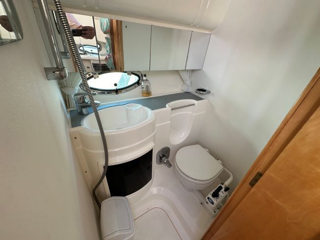 Separate head, with sink storage and shower to port opposite a fully-equipped galley with gas hob and oven, fridge, sink and plenty of storage.