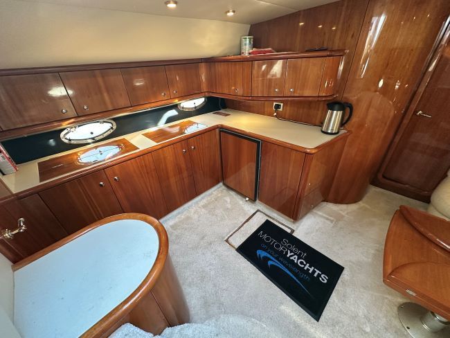 To starboard is the helm position and behind is the wet-bar with sink and fridge.