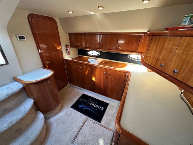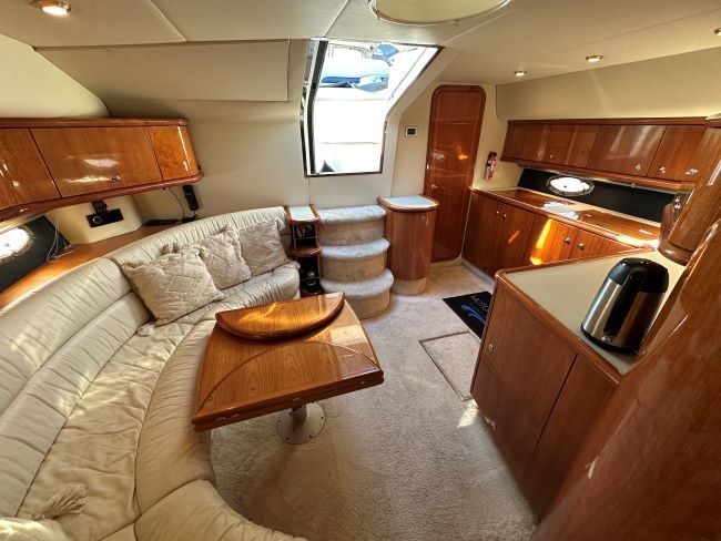 Via the companionway steps lead down into the fully carpeted saloon with galley (sink, 2 burner electric hob, fridge & microwave) to port and curved seating with extendable table to starboard.