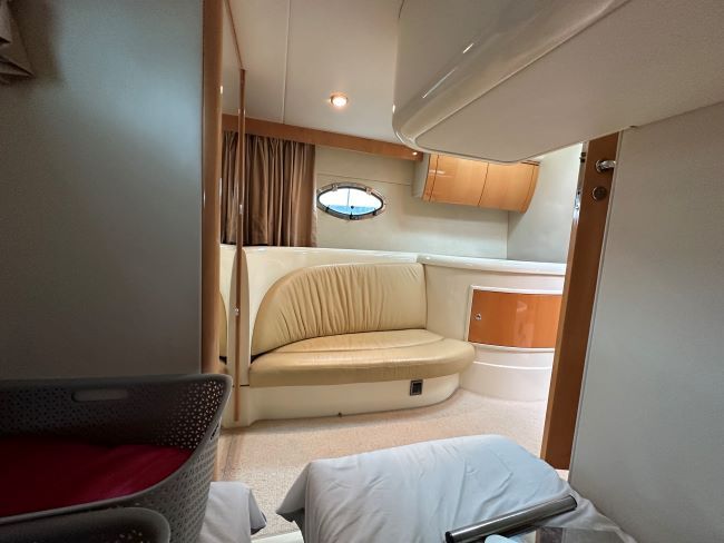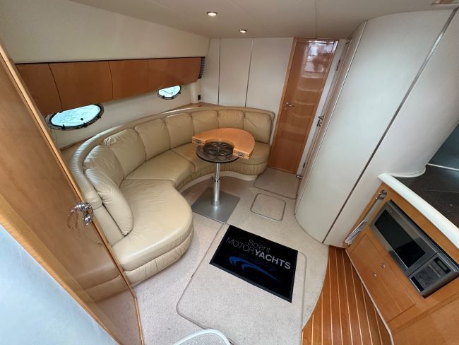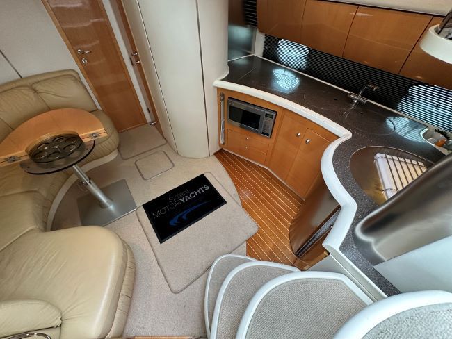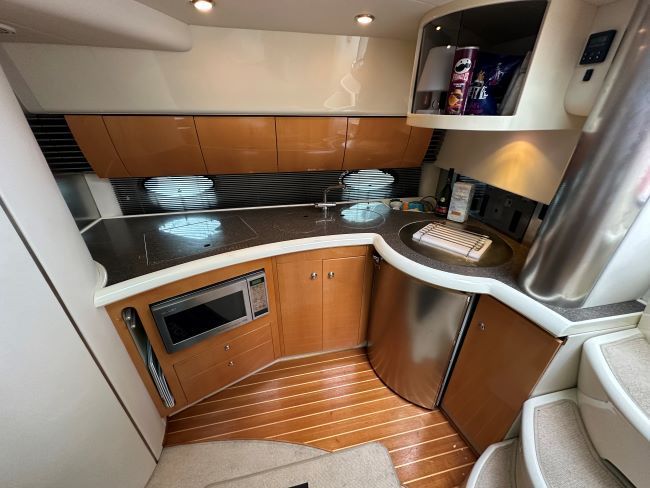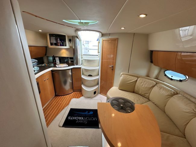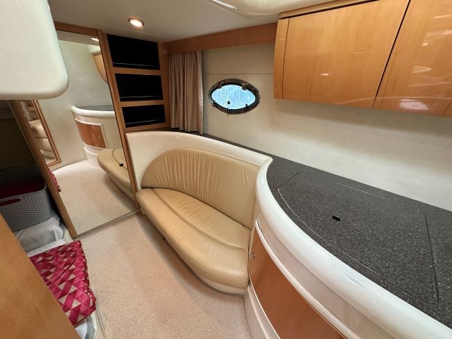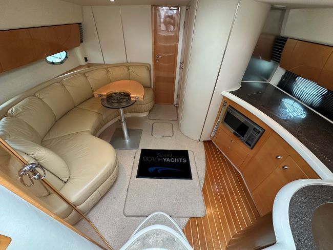 Spacious saloon/dinette to port upholstered in cream leather (that coverts to a double as and when required) opposite a comprehensive galley to starboard with gas hob, microwave oven, fridge plenty of storage.