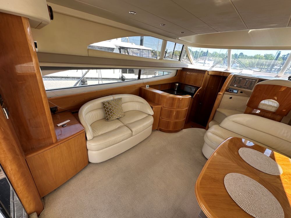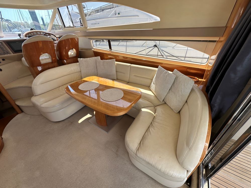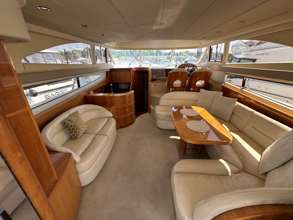 Large open-plan saloon, port side twin seat with custom TV bracket, additional drinks fridge and stowage lockers.