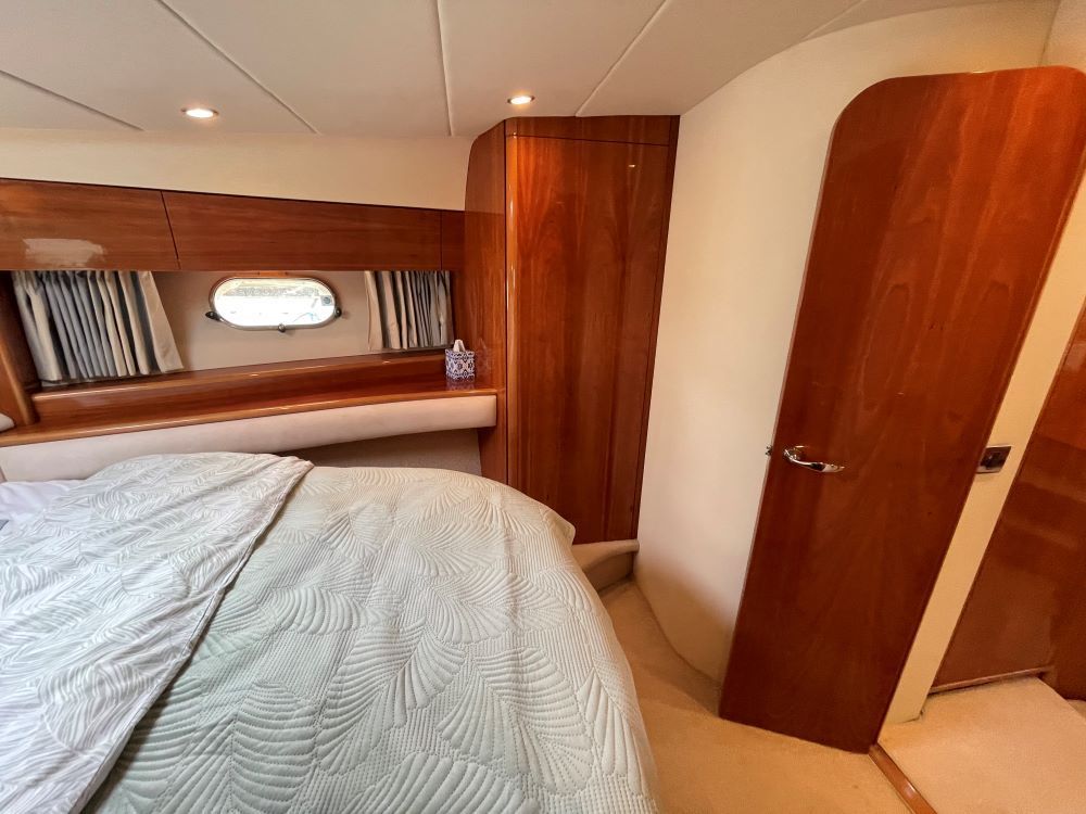 Master stateroom forward with large island double berth, twin drawers, twin hanging wardrobes, opening ports and high level storage lockers. Access through to en-suite heads compartment with rotating shower stall, electric toilet and hand basin with granite-effect counter top, stainless opening port and high level storage lockers