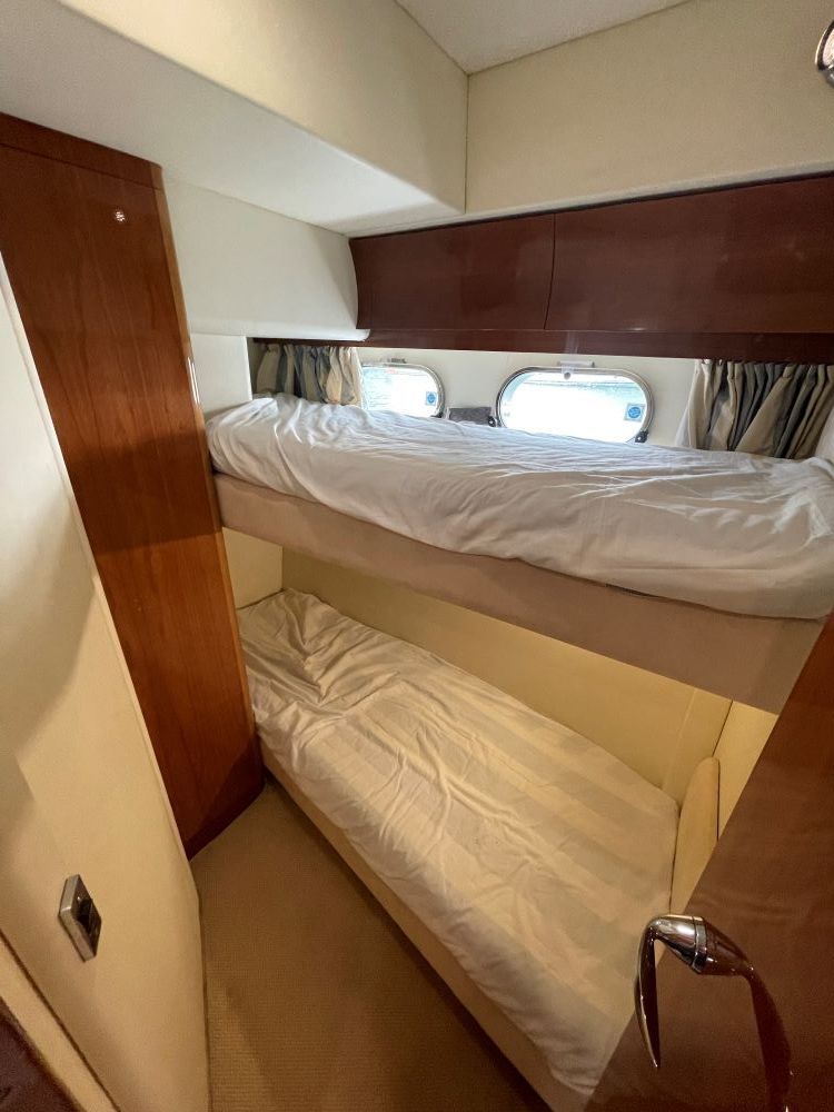 Third cabin to port with twin bunk beds and hanging locker, stainless opening ports and high level storage lockers.