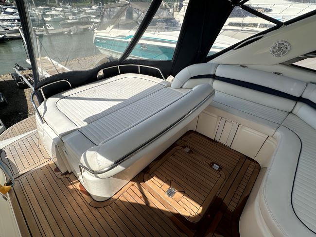 Access to cockpit via gate to starboard, with spacious seating to port, fully teak laid (excellent condition) and recently re-upholstered with recent cover covers.