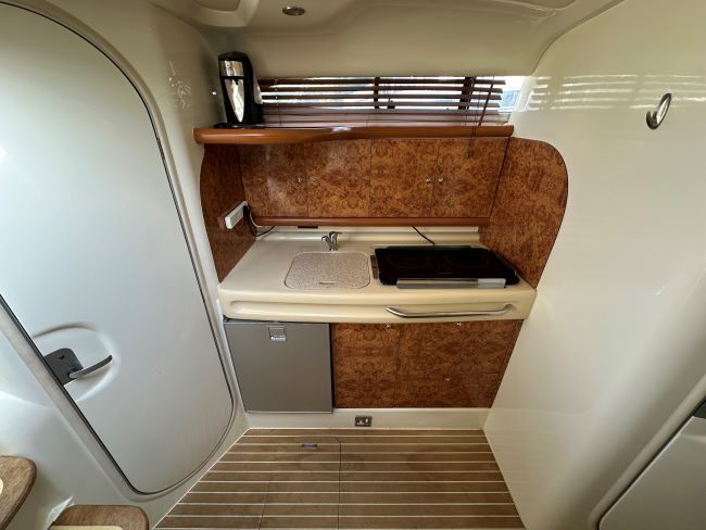 The galley to port has a refrigerator, twin elec hob and twin sinks as well as a microwave and storage.