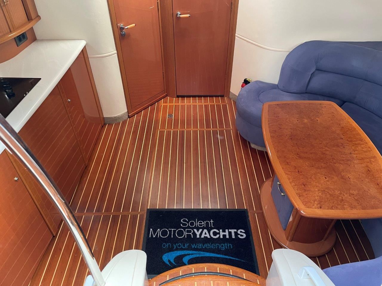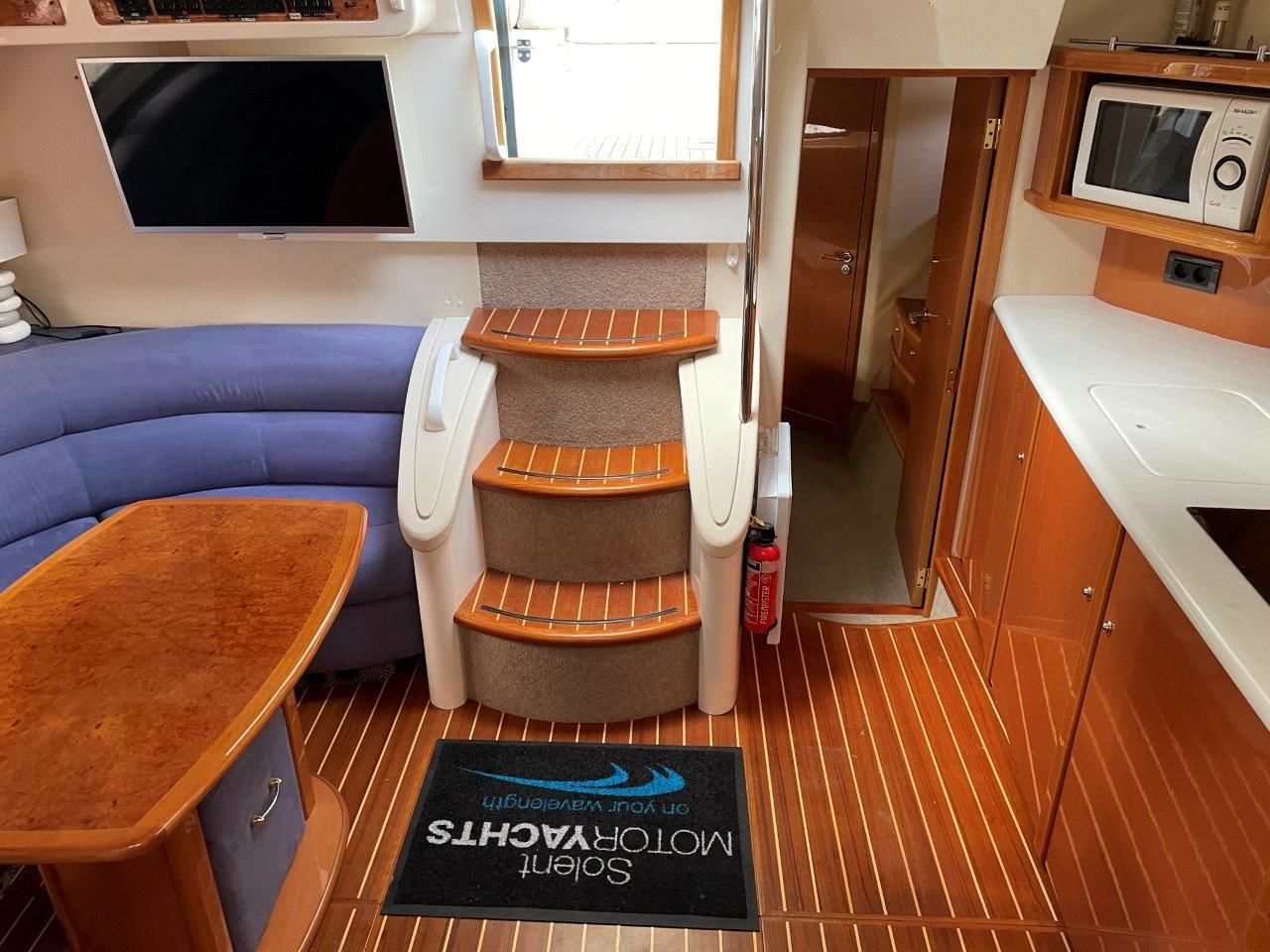 Large saloon seating to starboard upholstered in blue primma (with double berth conversion) opposite the fully-equipped galley with Sharp microwave/combi oven, 3 ring ceramic electric hob, large fridge and plenty of storage.