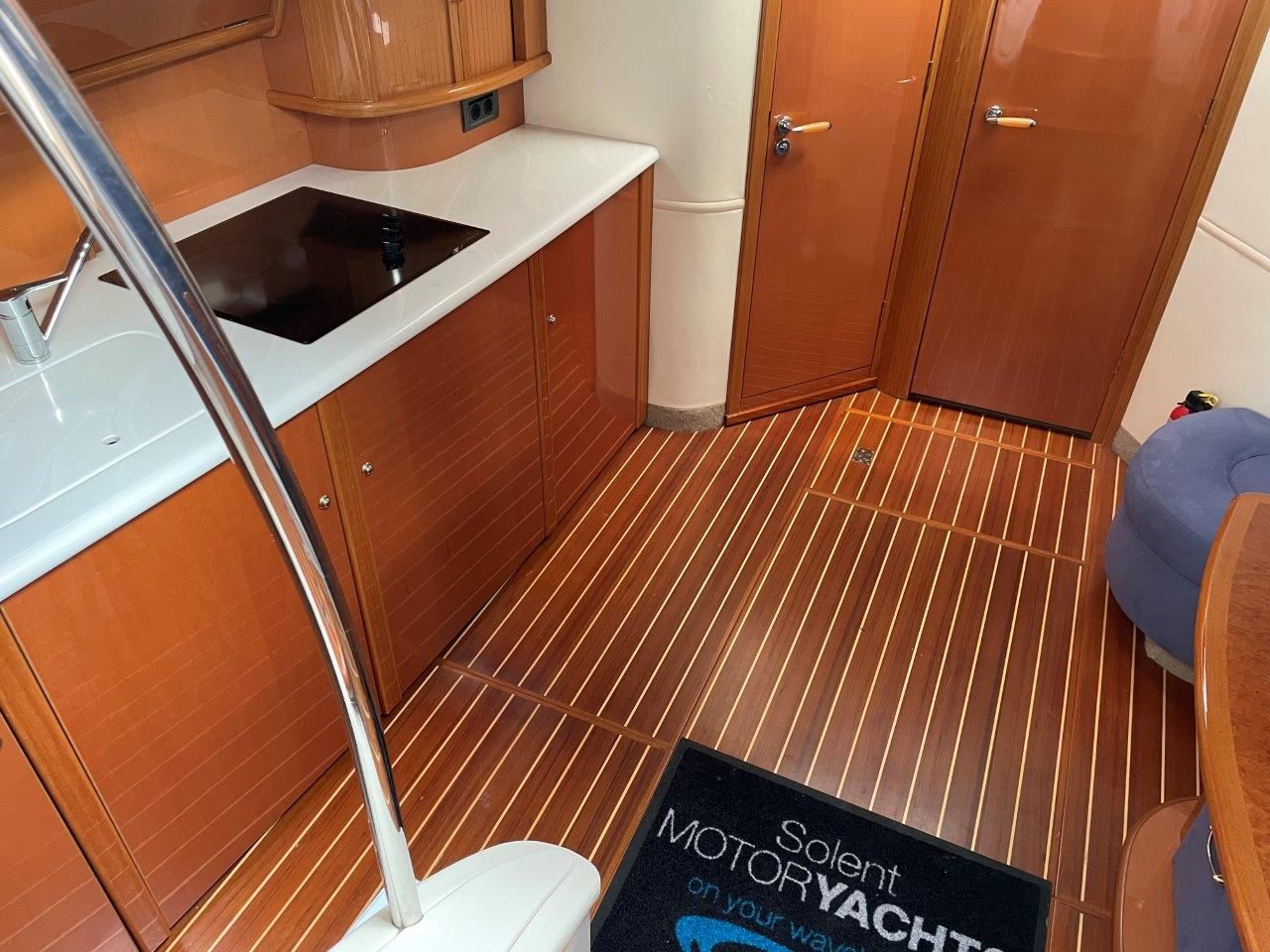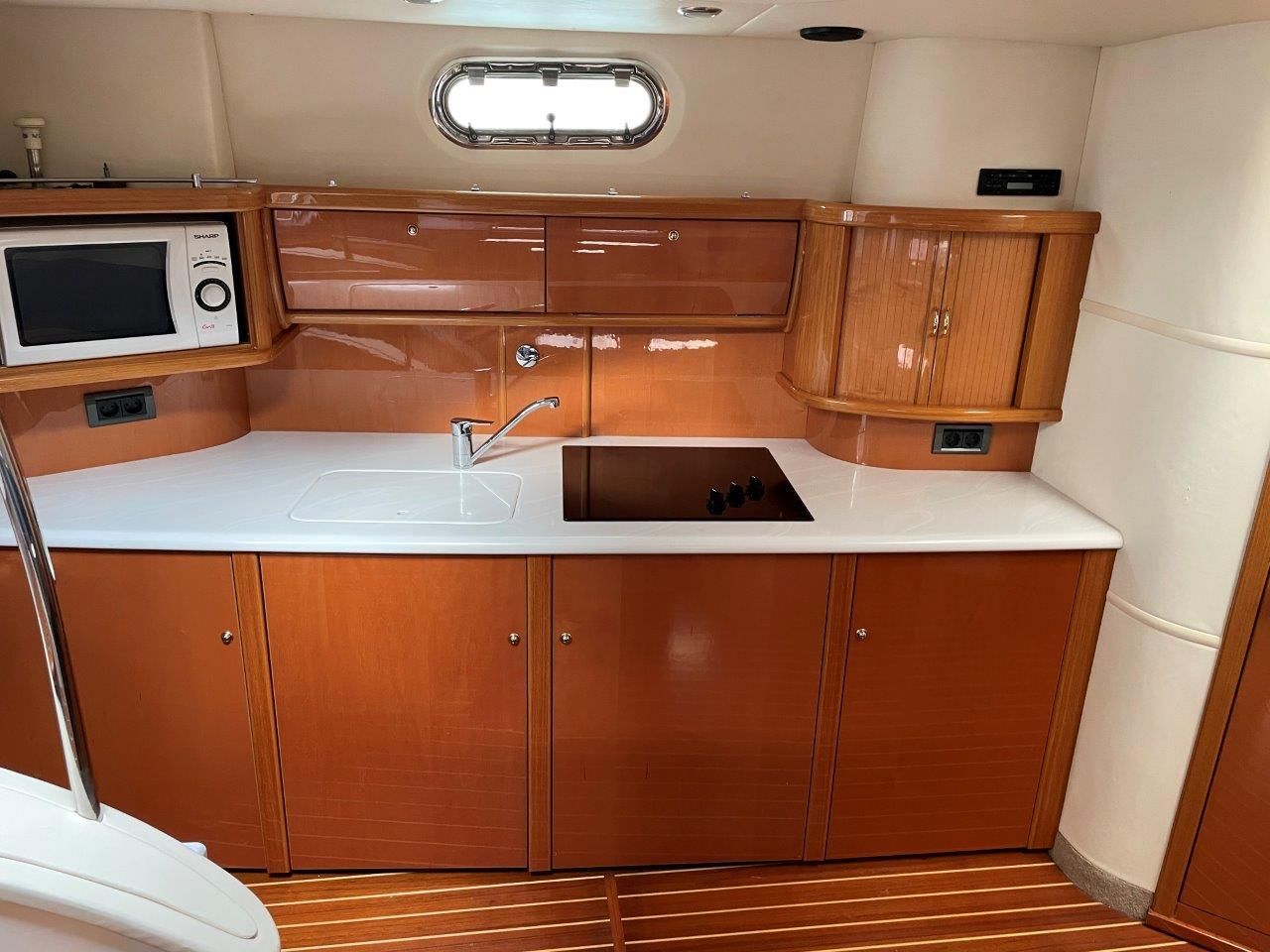 Wet bar with 12v fridge, sink to starboard with new Induction hob to port