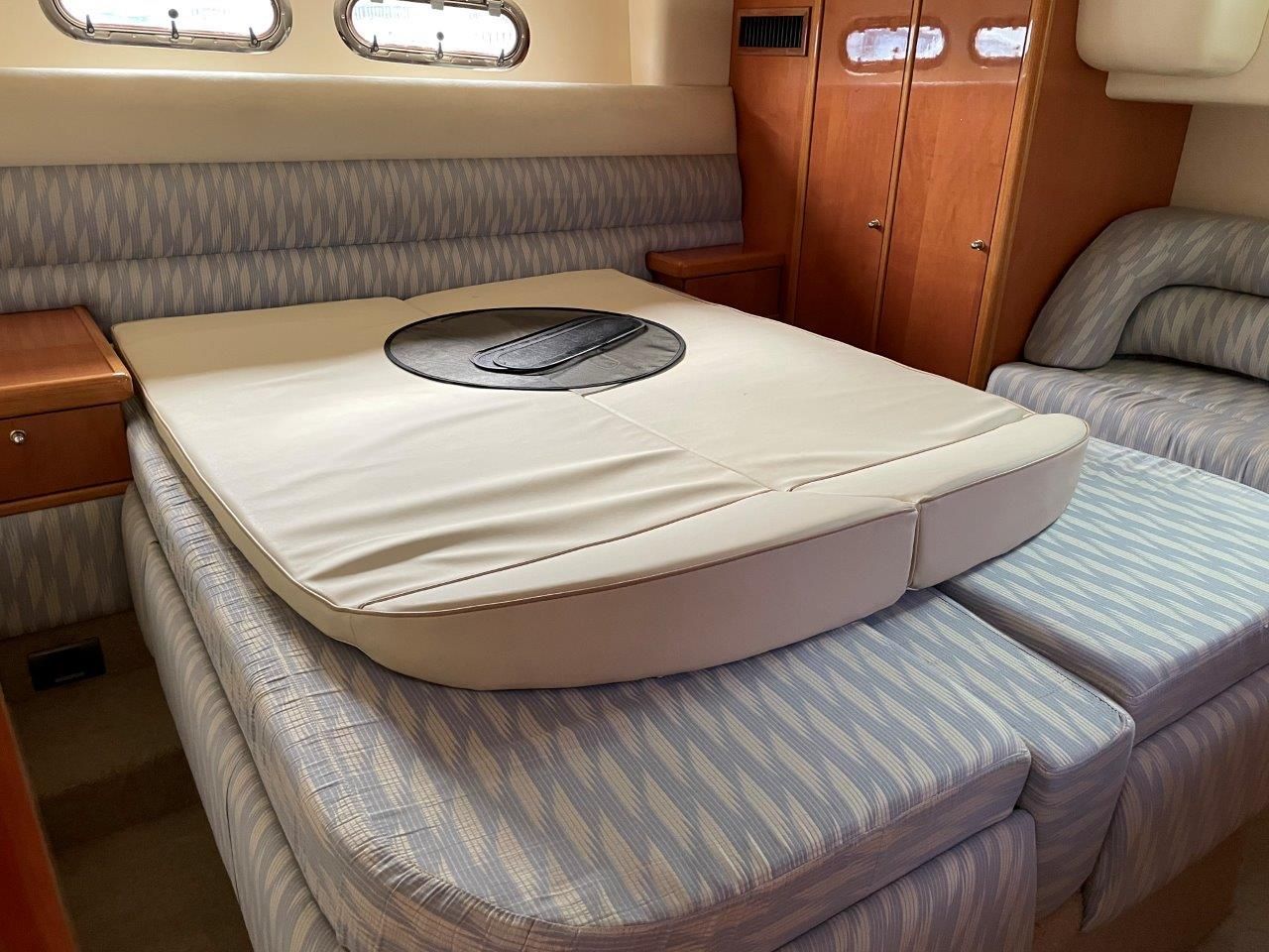 The full beam aft double cabin has a large double berth (new mattress), en-suite toilet/shower, dressing table, seating area, double wardrobes and circular hatch to cockpit. A true master cabin.