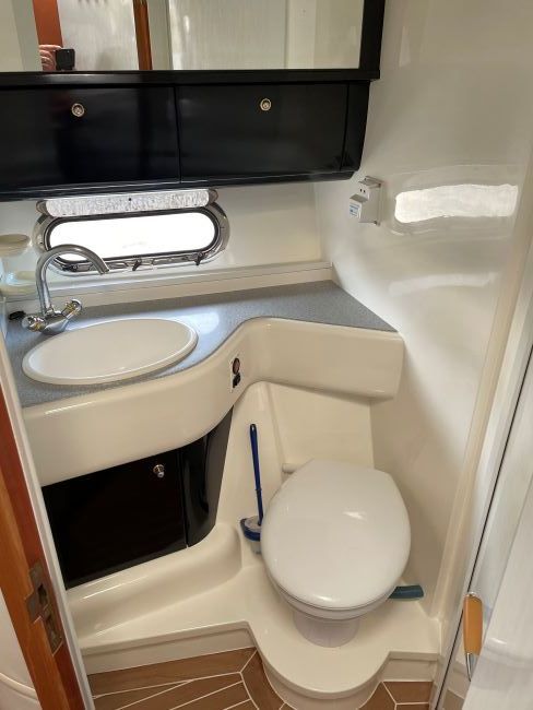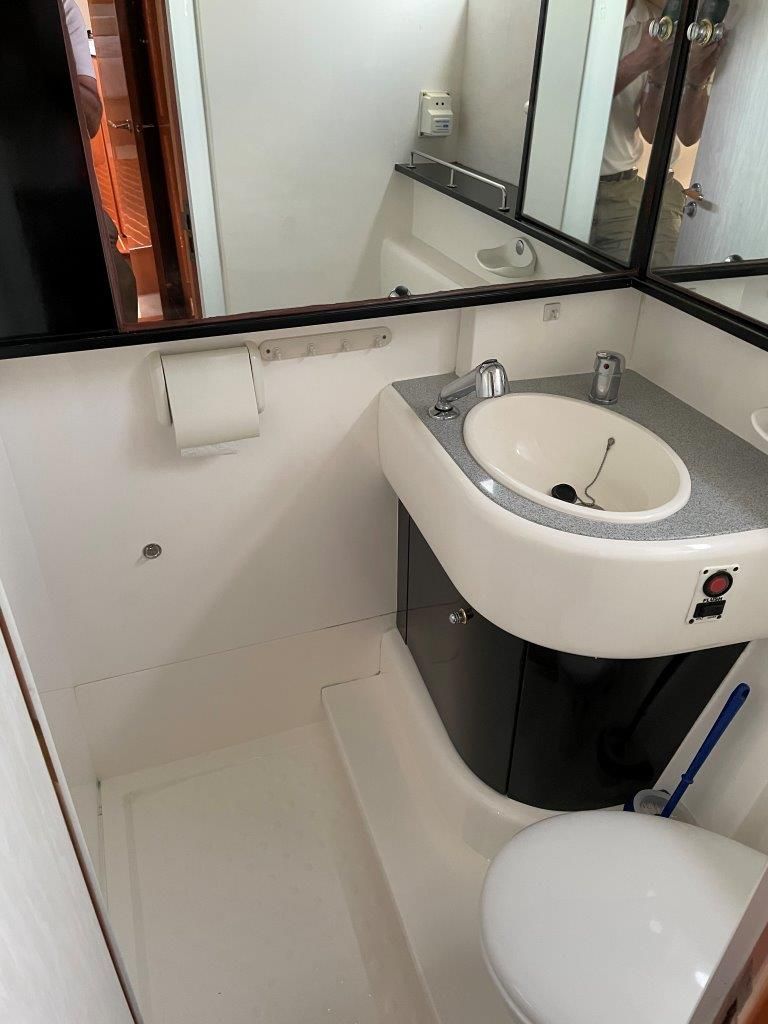 The forward double cabin (new mattress) is complete with en-suite toilet and shower, excellent storage/hanging space and vanity unit.
