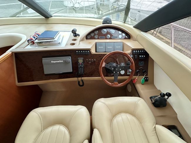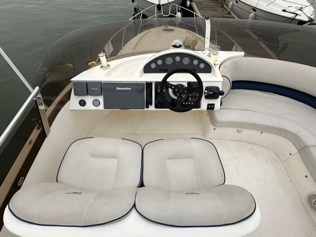 Helm to starboard with twin helm seats and all the navigation and engine instrumentation required.