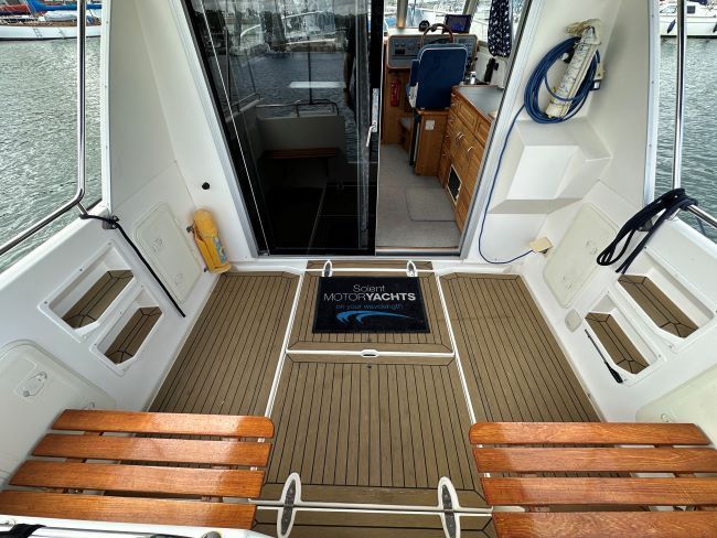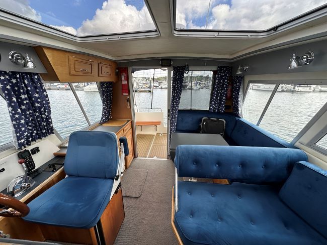 The Sea Saga 29 CV offers a central walk through transom door with a stable platform to a generous cockpit space with port and starboard seating. Sliding doors open to a well-proportioned saloon area, with the unusual benefit of a bench seat allowing either aft facing dining or forward facing with the helm.