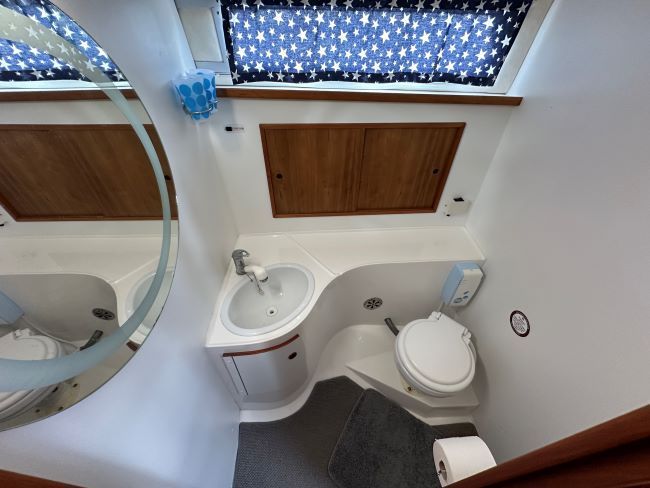 Washroom & head on starboard side between the cabins, complete with sink, an electric flushing sea toilet with SeaSmart inline anti smell system to a holding tank in a cockpit locker and shower with electric pump to empty.