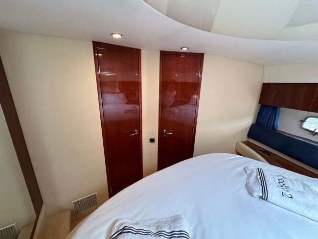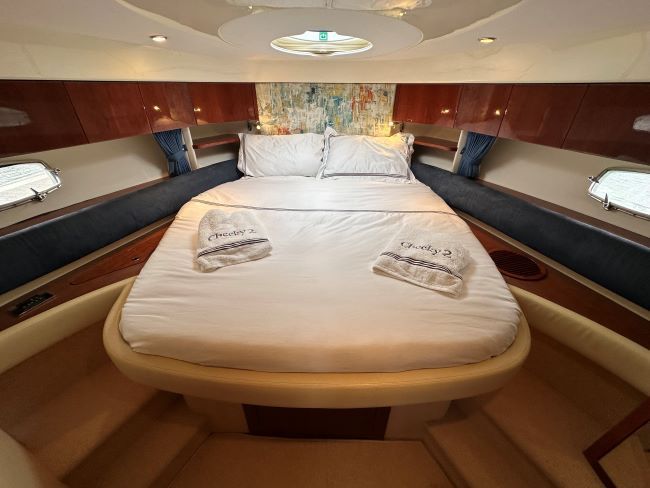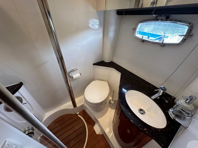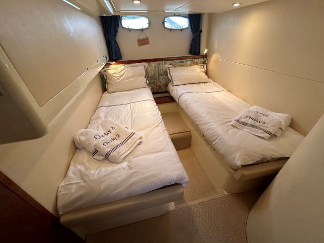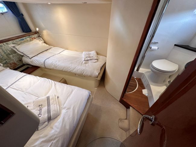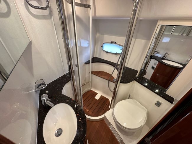 Twin single berths or double cabin with bedside lights, mirror doored lockers and en suite heads with fresh water flush electric toilet, handbasin set in Copper Canyon Avonite and separate shower cubicle, mini venetian blind to porthole.