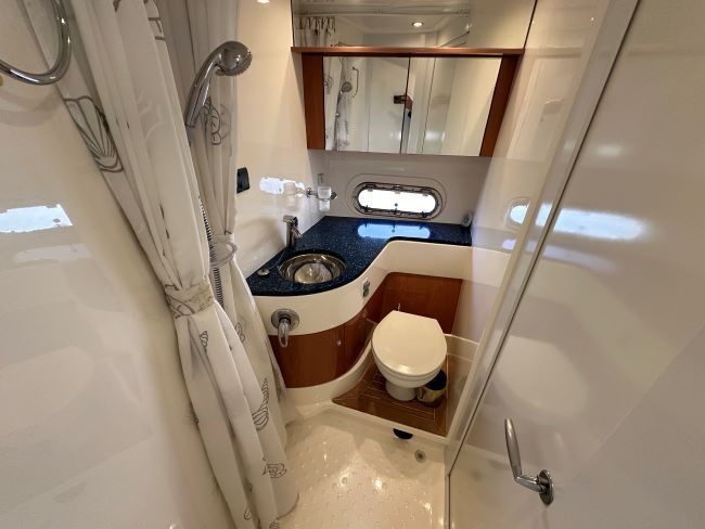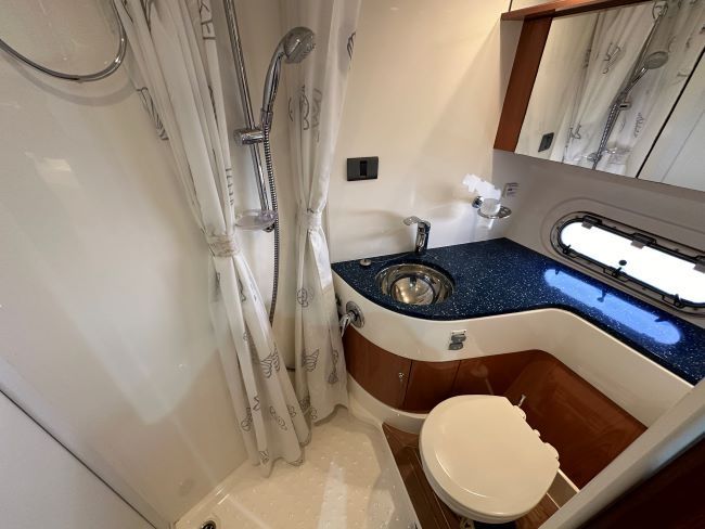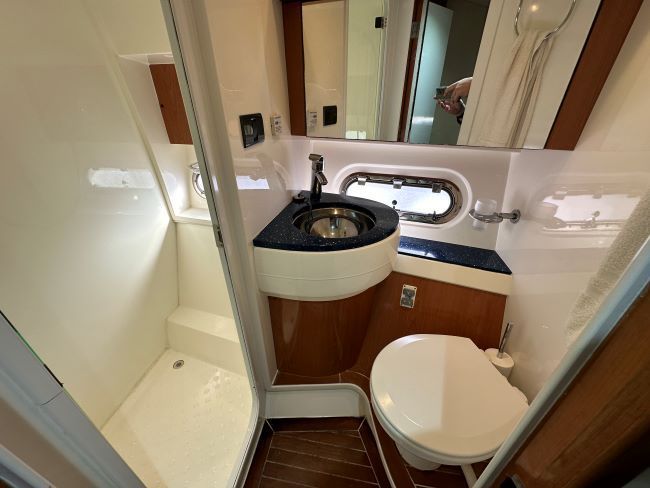 Master en-suite heads compartment with quiet electric flush fresh water marine toilet, handbasin and separate shower compartment
