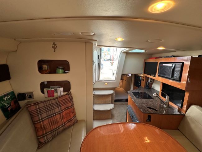 Fully equipped galley to port complete with elec hob, fridge, s/steel sink, microwave, plenty of storage and teak and holly flooring