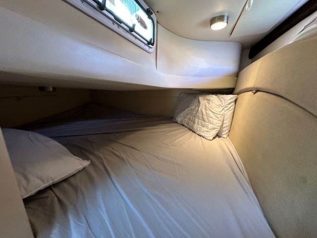 Large aft double berth under cockpit sole with privacy curtain