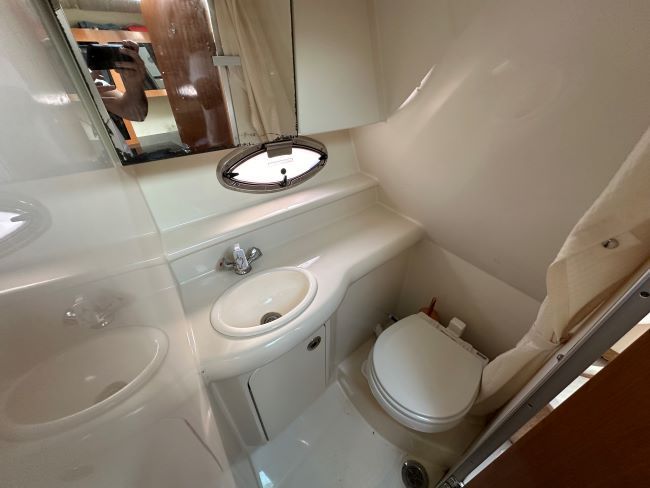 Separate head to starboard with VaCu flush sea toilet (with holding tank), sink with H&C pressurised water