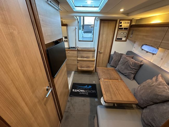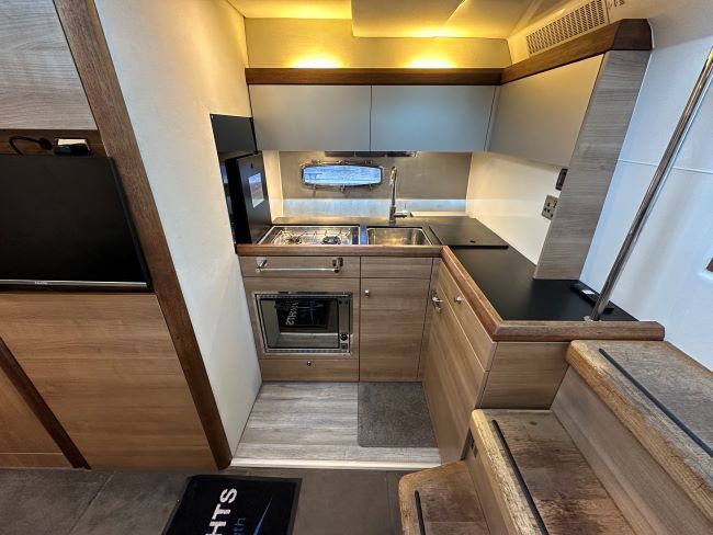 Comfortable L-shaped saloon to port with fully-equipped galley to starboard