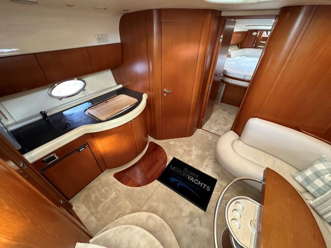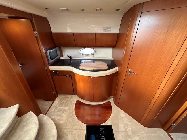 Below deck, elegance and refined materials provide the perfect welcome. The leather sofa, hi-lo table, the elaborately worked cherry wood: a demonstration that little details can make a big difference adding style to the comfort and fully-equipped galley