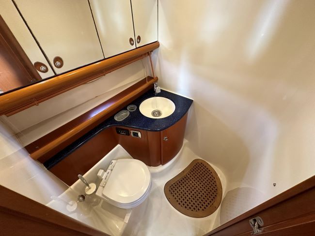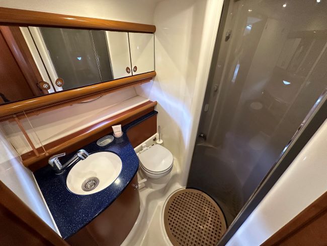In the bow, another spacious island double berth, with drawers and plenty of storage and private en-suite with vacu-flush toilet, sink, high level mirrored cupboards and rotating shower stall.
