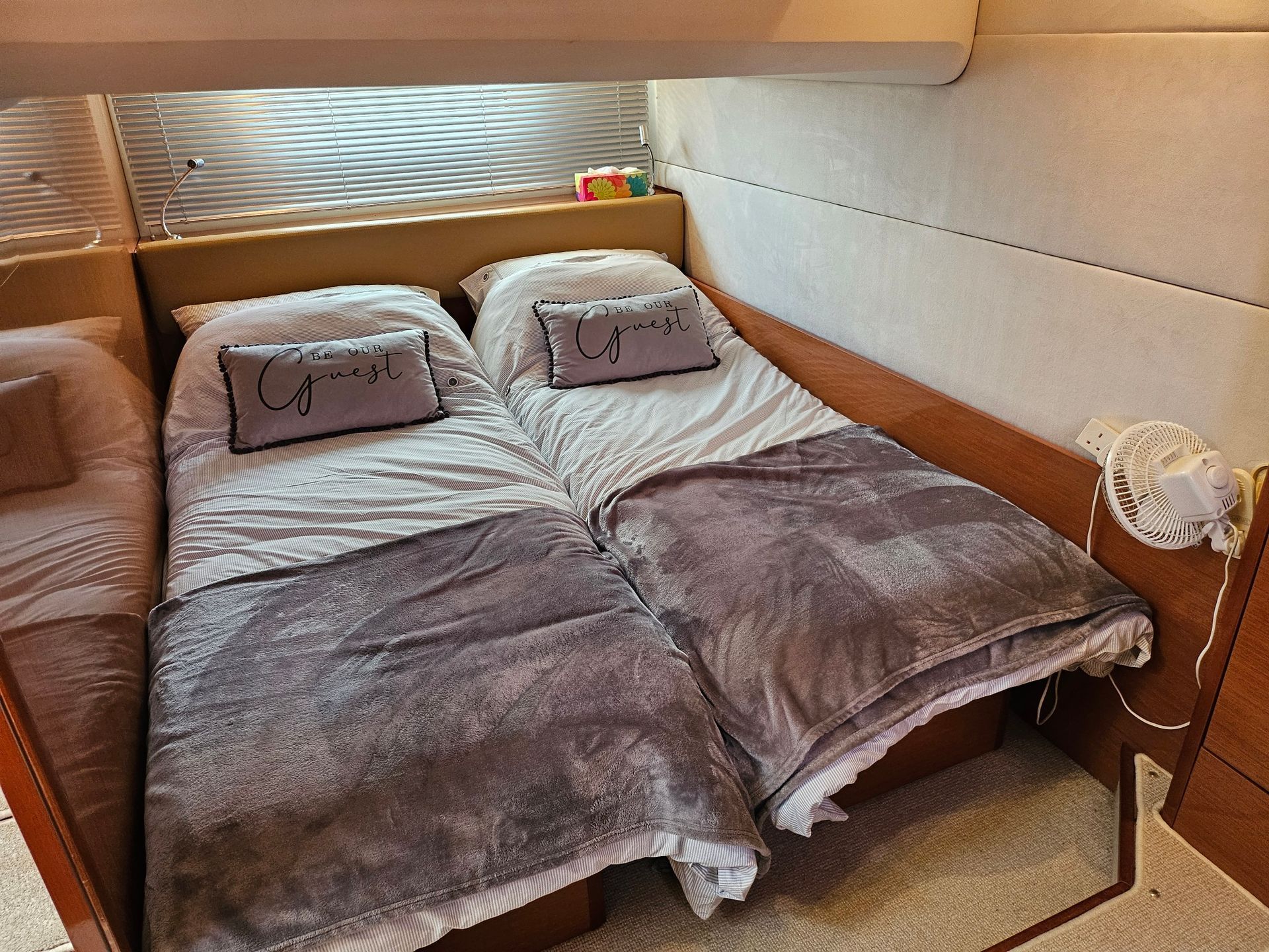 Large aft cabin with twin berths that can be joined to make a double and sofa.