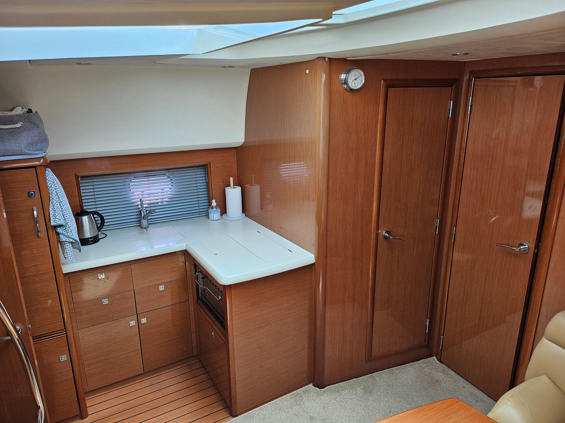 Saloon seating to starboard upholstered in leather which converts to a double berth, opposite the fully-equipped galley with new fridge.