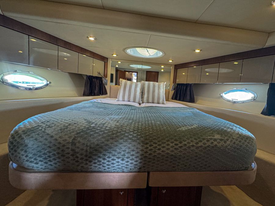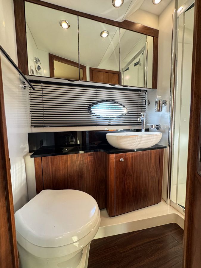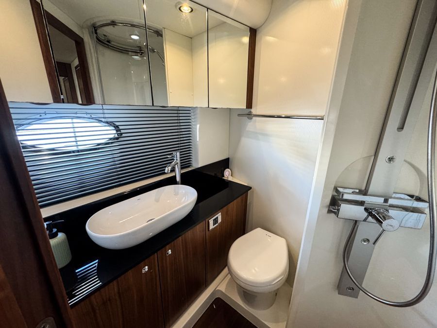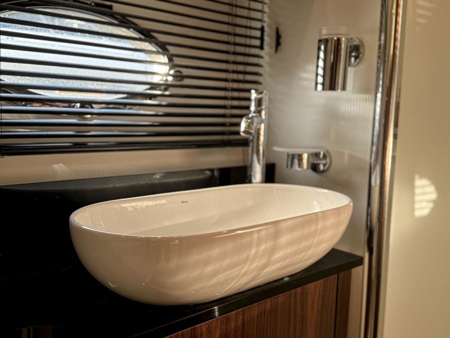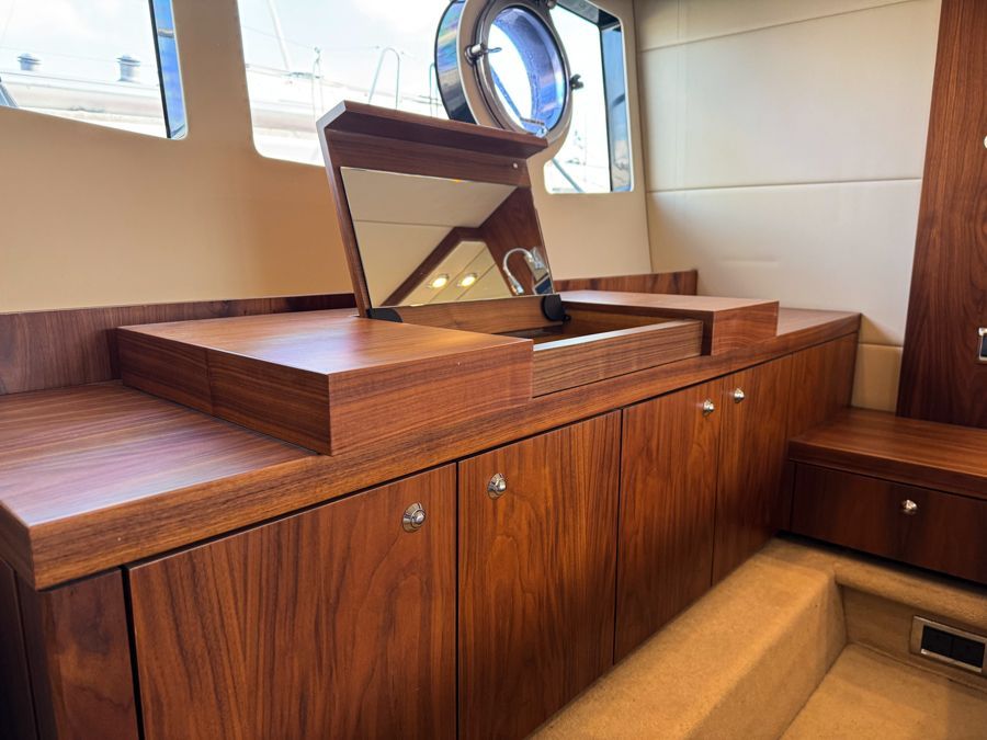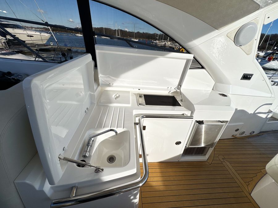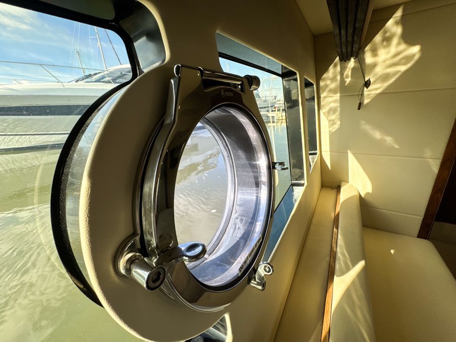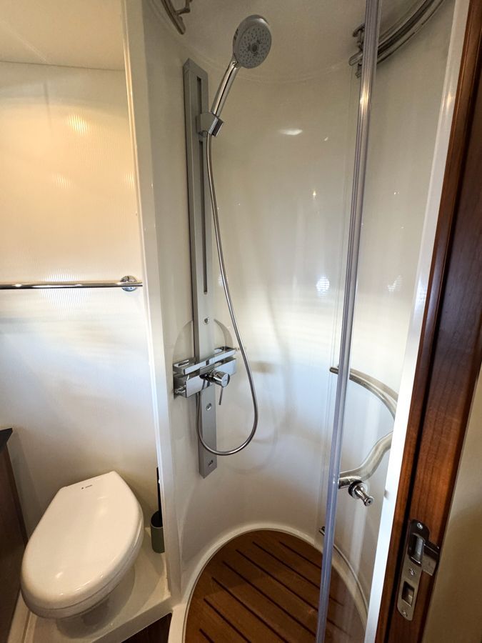 Below deck, the accommodation feels bright and well finished. The satin walnut interior gives a warm, contemporary look, complemented by the larger porthole option which enhances the boats nautical aesthetics both inside and out. The full-beam midships owner’s cabin is generous and comfortable with its own en-suite, while the forward guest cabin offers flexible twin or double berth arrangements, also with en-suite access. Air conditioning throughout ensures comfort in warmer climates and a newly fitted heating system fitted in the cockpit.