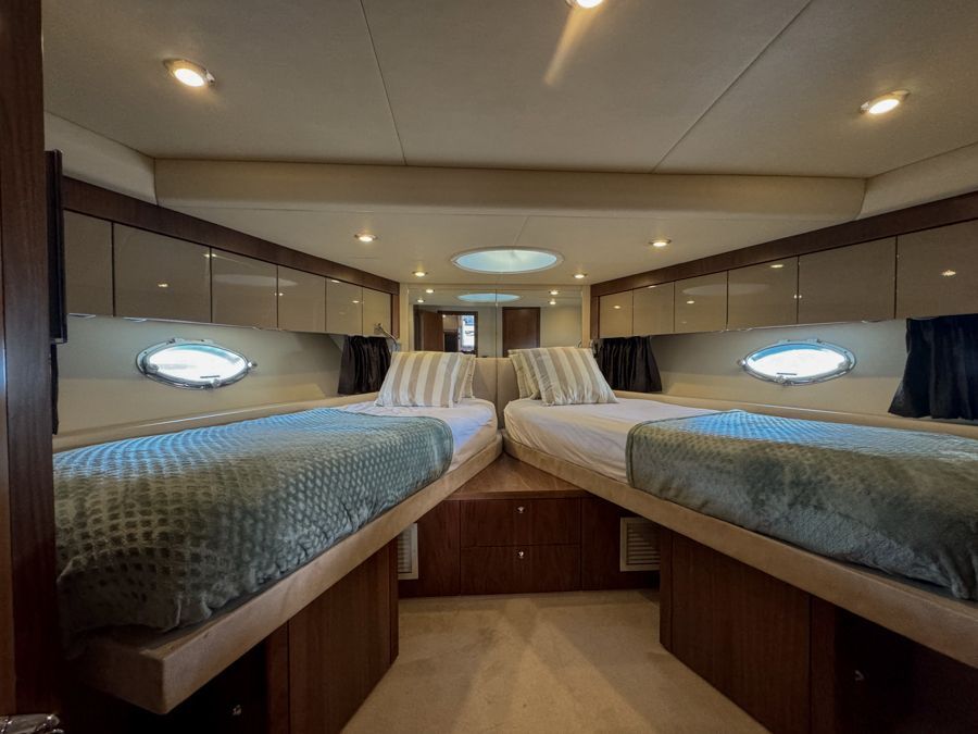 Forward scissor berth twin/double cabin with TV, plenty of storage and private en-suite head and shower