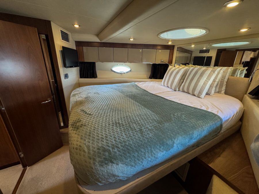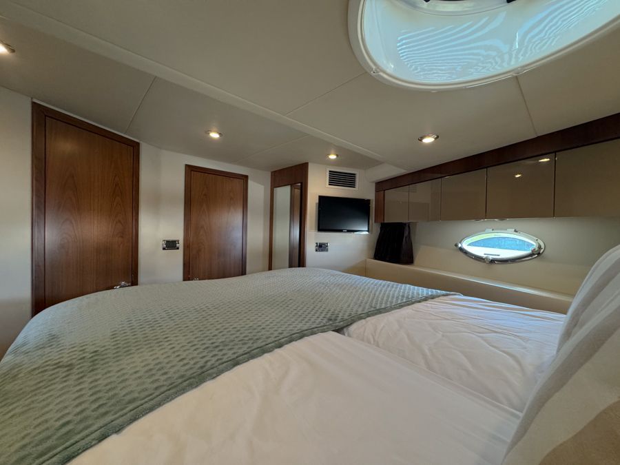 Full-beam midship master cabin (sprung mattress) with sofa, plenty of storage TV and en-suite access to day head