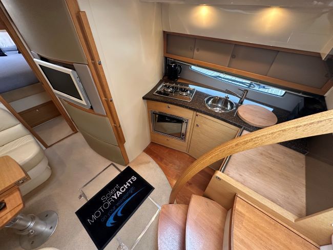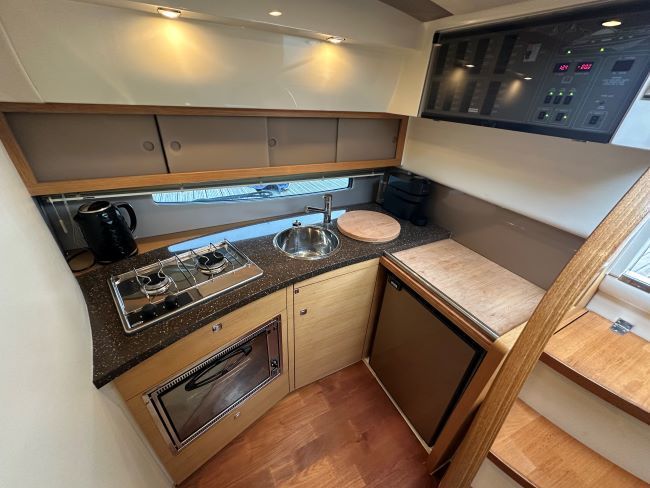 Comprehensive galley opposite saloon with TV & DVD and JVC stereo.